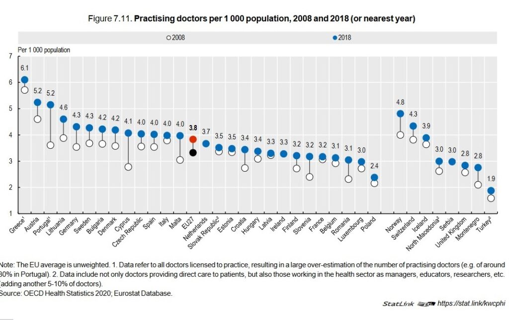 Warto podkreślić, że wzrost kosztów usług medycznych wynika z czynników obiektywnych – przede wszystkim z małej liczby lekarzy. Polska jest pod tym względem na ostatnim miejscu wśród krajów Unii Europejskiej (UE). Mamy zaledwie 2,4 lekarzy na 1 tys. mieszkańców. Unijna średnia to 3,8. Jednocześnie zajmujemy 7. miejsce pod względem liczby konsultacji na osobę (7,6). Po zderzeniu ze sobą tych dwóch statystyk okazuje się, że lekarze w Polsce udzielają w ciągu roku najwięcej konsultacji w UE!