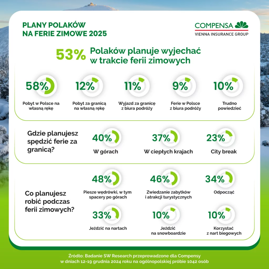 20 stycznia rozpoczynają się ferie w pierwszych województwach: kujawsko-pomorskim, lubuskim, małopolskim, świętokrzyskim i wielkopolskim. Z tej okazji Compensa po raz trzeci* zbadała plany Polaków na zimowy wypoczynek. W tym roku na ferie planuje wyjechać rekordowy odsetek badanych – aż 53%. To prawie dwa razy więcej niż w ubiegłym roku, gdy w analogicznym badaniu chęć wyjazdu deklarowało 30% osób. 43% ankietowanych spędzi ferie z rodziną i dziećmi, a 42% z partnerem lub partnerką. Co piąty badany (18%) wyjeżdża z przyjaciółmi, a co dziesiąty samotnie. 5% Polaków wyśle swoje dzieci na obóz. Jeśli chodzi o środek transportu niemal dwie trzecie osób (65%) planuje dotrzeć na ferie samochodem, 21% wybierze pociąg, a 18% samolot.
