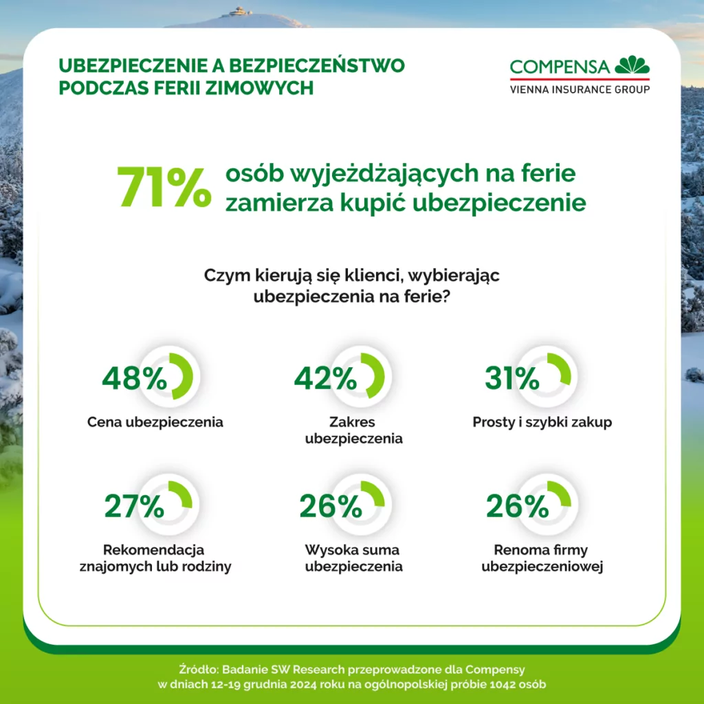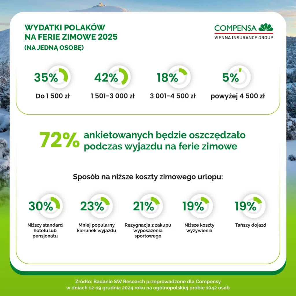 Rozpoczynające się ferie zimowe będą dla Polaków czasem nie tylko wypoczynku, ale także finansowych kompromisów. Choć ponad połowa z nas planuje wyjazd, większość szuka oszczędności – wybiera tańsze hotele lub mniej popularne kierunki. To efekt rosnących cen, które sprawiają, że zimowy wypoczynek będzie droższy niż przed rokiem – wynika z badania „Wyjazdy Polaków na ferie” przeprowadzonego na zlecenie Compensy. Nie planujemy jednak oszczędzać na zakupie ubezpieczenia. 71% Polaków nie wyobraża sobie zimowego wyjazdu bez odpowiedniej polisy.