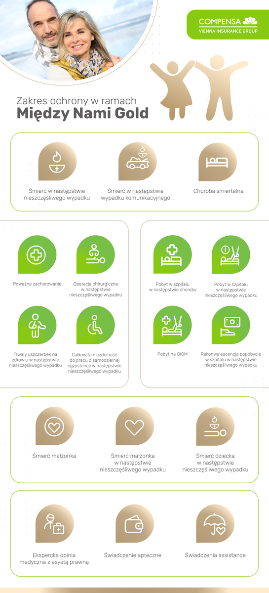 Między Nami Gold to m.in. finansowe zabezpieczenie rodziny na wypadek naszej śmierci. Świadczenie otrzymasz również w przypadku zdiagnozowania nieulaczalnej choroby. Ubezpieczenie uwzględnia również etapy powrotu do zdrowia po nieszczęśliwym wypadku. Pobyt w szpitalu w następstwie choroby czy po wypadku, operacja chirurgiczna, pobyt na OIOM, rekonwalescencja. W każdym z tych przypadków otrzymamy świadczenie w ramach ubezpieczenia na życie Między Nami Gold.