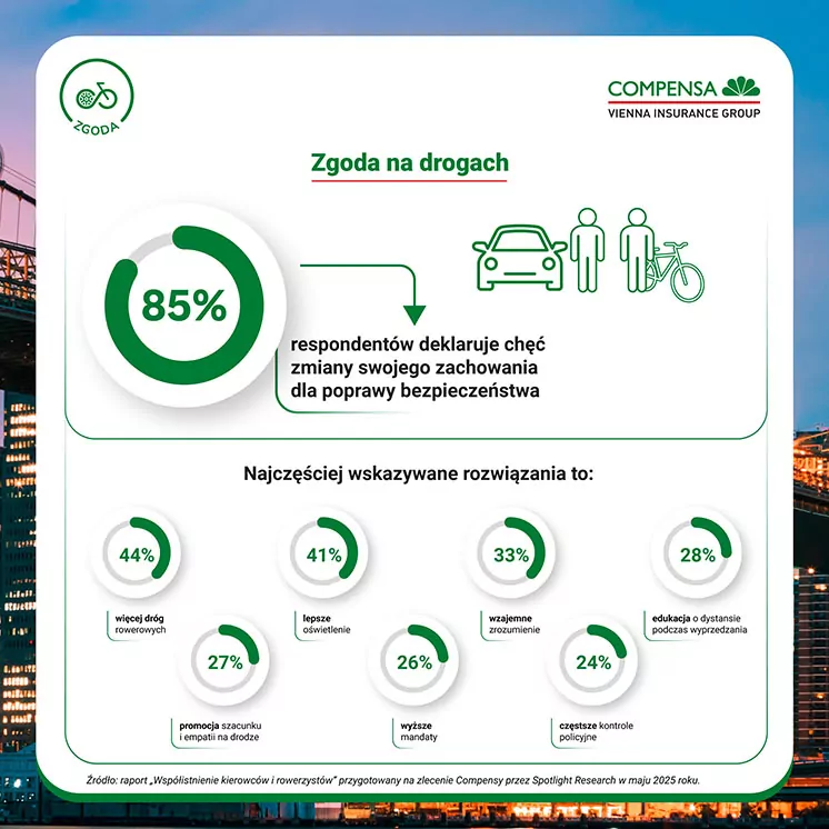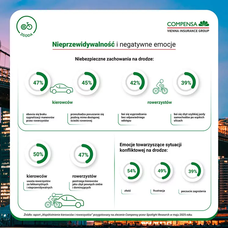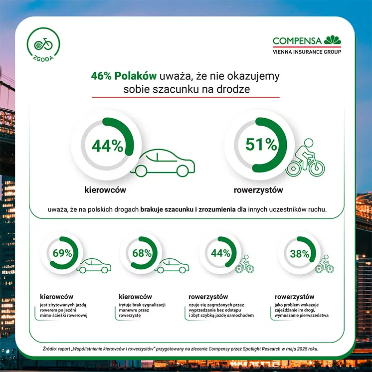 Compensa sprawdziła, jakie są źródła napięć między kierowcami i rowerzystami – dwiema największymi grupami użytkowników dróg. Co drugi kierowca postrzega rowerzystów jako lekkomyślnych i nieprzewidywalnych, a 47% rowerzystów uważa, że kierowcy są zbyt pewni i dominujący na drodze. Kierowców najczęściej irytuje jazda rowerem po jezdni mimo obecności ścieżki rowerowej (59% wskazań), brak sygnalizacji manewrów (58%) czy przejeżdżanie przejściami dla pieszych (42%). Rowerzyści wskazują bliskie wyprzedzanie (44%), nadmierną prędkość aut (43%) czy wymuszanie pierwszeństwa (38%).